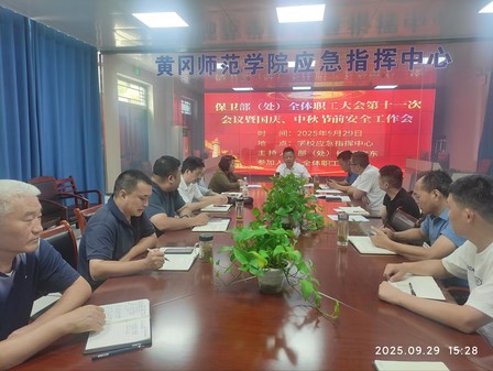 9月29日,保卫部(处)在学校应急指挥中心开展全体职工大会第十一次会议暨国庆、中秋节前安全工作会议。保卫部(处)部(处)长冯海东主持会议,并讲话。