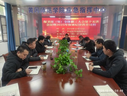 副部(处)长刘全菊传达学习湖北省教育厅办公室印发《关于加强政务信息报送工作的提示》《中华人民共和国保守国家秘密法》,中共黄冈师范学院委员会深入贯彻中央八项规定精神学习教育工作专班办公室印发《工作提示(十四)》和学校保密办印发《关于开展2025年下半年保密工作安全检查的通知》。